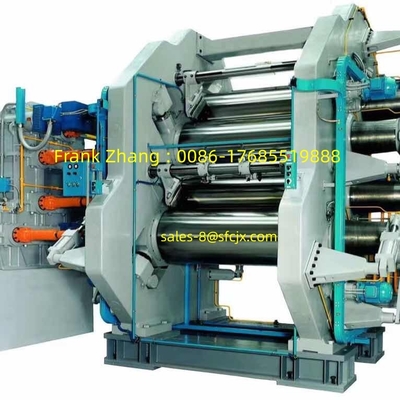 The machine may also include additional features such as temperature control systems, cooling mechanisms, and trimming devices to enhance the calendering process and achieve the desired final product specifications.